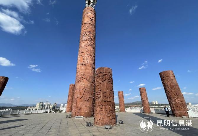 观象台顶部广场矗立着十根图腾神柱,用红色赭沙石雕刻而成,红柱的高、矮、粗、细和摆放的位置非常讲究,是按照“毕摩”立杆观测太阳以定季节的原理并通过天文学家的测定设计的,观测效果十分精确。位居中央的是巨大的“祖先神柱”,直径3.5米,顶端是“三女托太阳”不锈钢雕塑,像一颗璀璨的星星闪烁在北斗星的正下方。