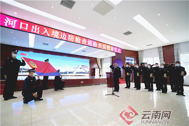 河口出入境边防检查站隆重举行新入职检查员授章仪式。通讯员供图
