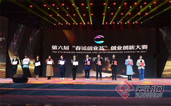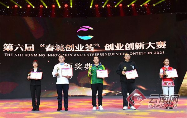 12月22日,第六届“春城创业荟”创业创新大赛总决赛暨颁奖典礼在昆明举行。现场经过各个环节评比,最终决出各组奖项:创意组一等奖项目为云炭——典型工业炉窑烟气脱硫;返乡创业组一等奖项目为正气:滇菜国际化便携式古法蒸馏云南汽锅鸡的开创者;国际组一等奖项目为绿巨能旧衣回收+分拣;企业组一等奖项目为花语茶意——世界首创环保鲜花新材料;直播营销组一等奖项目为云南小花。