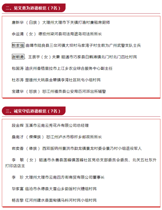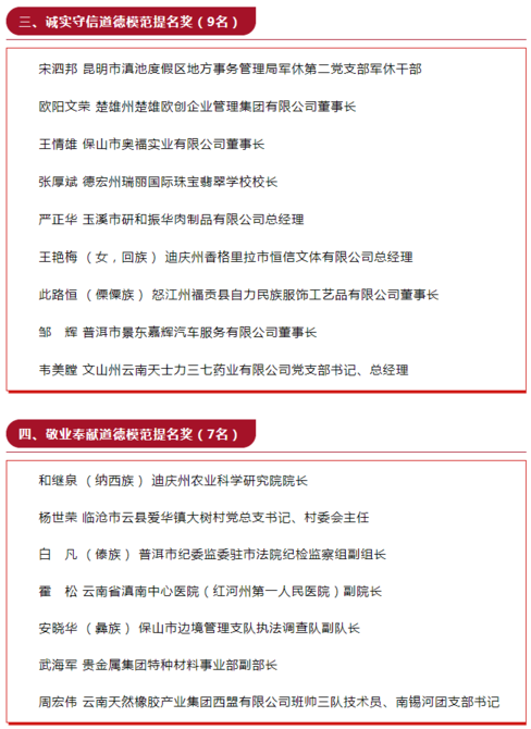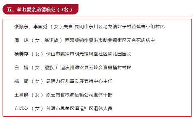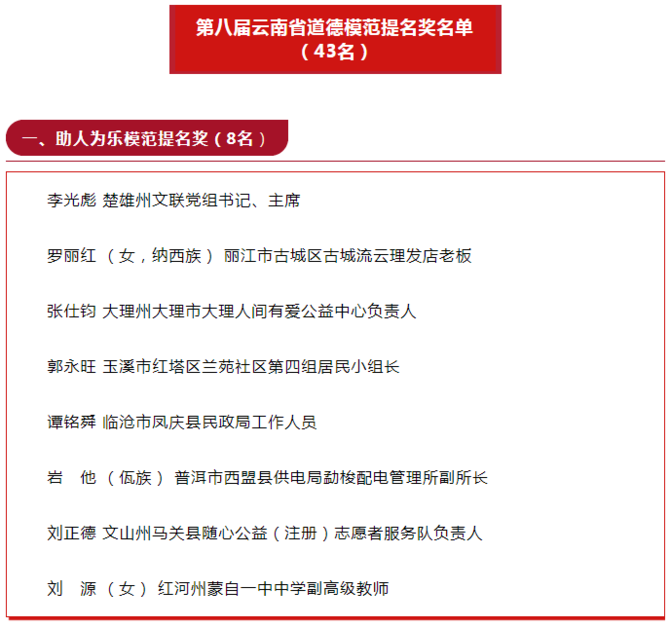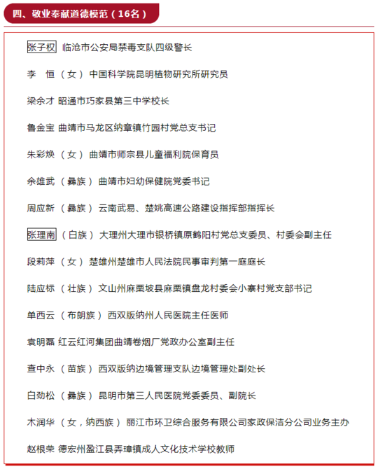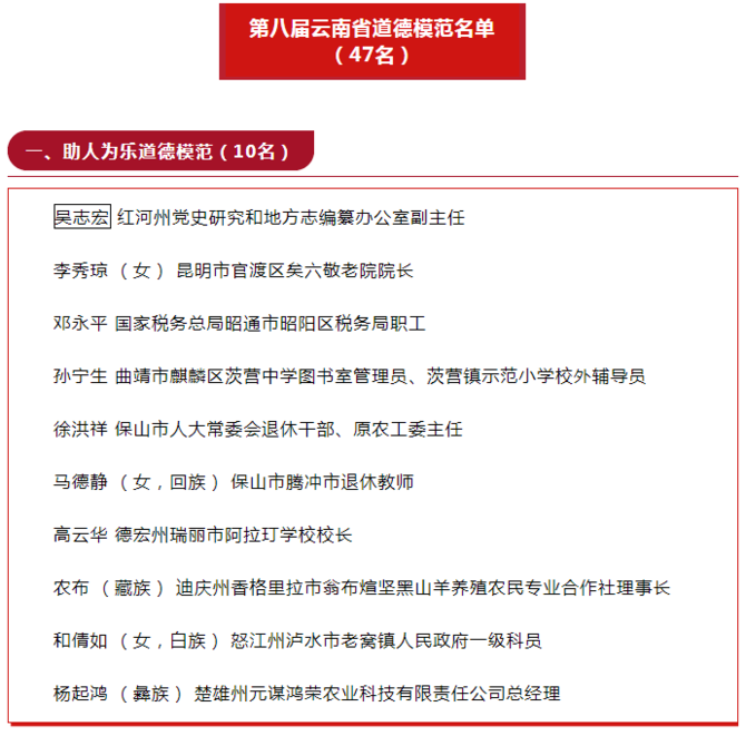 12月23日上午,第八届云南省道德模范表彰活动在昆明举行。吴志宏等47名第八届云南省道德模范、李光彪等43名提名奖获得者受到表彰。