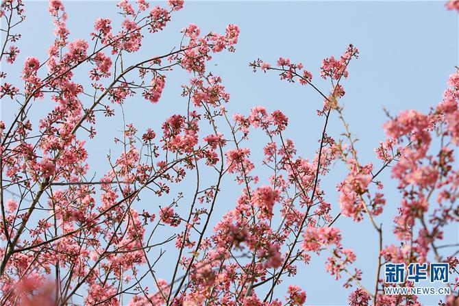 冬日里,云南省曲靖市城区各公园、小区及道路旁,随处可见一株株冬樱花在暖阳中绽放,花团锦簇、美不胜收,给冬日的城市增添了一道靓丽的风景线。(杨俊鹏摄影报道)