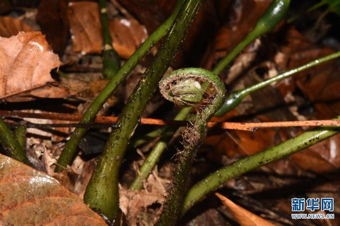 素功莲座蕨,莲座蕨属新种,发现于云南大围山国家级自然保护区。虽然是“新面孔”,但事实上,莲座蕨属植物起源悠久,是现存最古老的蕨类植物之一。它的名字背后也还有一段故事,科研工作者将其命名为“素功”,以此纪念中国科学院昆明植物研究所已故植物学家武素功对中国蕨类植物研究作出的重要贡献。图为素功莲座蕨幼叶(资料图片)。新华网发(云南大围山国家级自然保护区 供图)