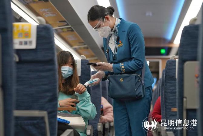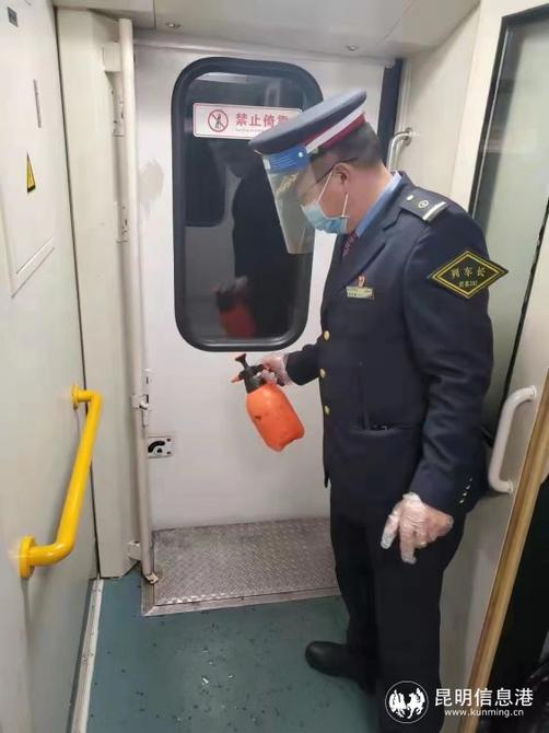 针对列车上的疫情防控措施,昆明局集团在每趟列车上都配备有“疫情应急包”,认真落实重点部位的定时消毒,并加强对旅客佩戴口罩宣传,利用查验车票时机对旅客“健康码、行程码”进行核验。