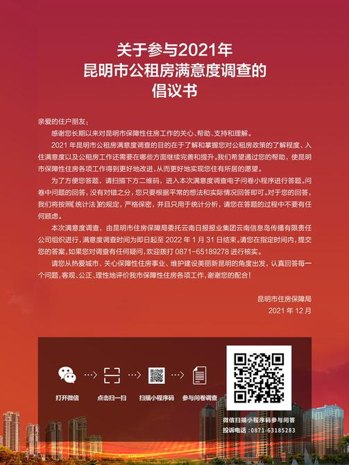 昆明市住房保障局相关负责人表示:“您的回答将得到严格的保密,并且只用于统计分析,请您在答题的过程中不要有任何顾虑,扫描下方倡议书上的二维码,为昆明市保障性住房事业发展建言献策,为建设美丽新昆明出一份力。”