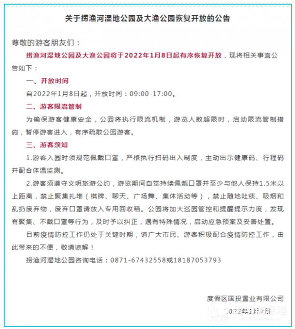 今日,度假区国投置业有限公司发出《关于捞渔河湿地公园及大渔公园恢复开放的公告》,公告中称,以上两个公园于2022年1月8日起有序恢复开放,开放时间为09:00-17:00。开放期间将对游客进行限流管理,游览人数超限时,启动限流管制措施,暂停游客进入,有序疏散公园游客。