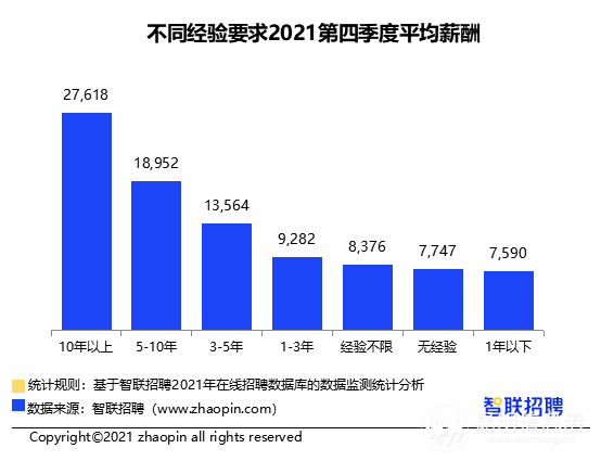 博士的平均招聘薪酬最高,为26587元/月;硕士位于第2位,为17302元;本科的平均招聘薪酬为13670元;大专学历的岗位平均招聘薪资为9464元/月;初中及以下的岗位薪资为6979元/月。要求10年以上工作经验的岗位,平均薪酬高达27618元/月,要求1年以下经验的岗位,平均月薪为7590元。(6686体育 记者江枫)