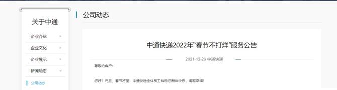 2022年“春节期间”,中通快递将继续为广大客户提供“全年无休”的快递服务,满足节日期间的寄递需求,保障防疫、民生物资的畅通运输。