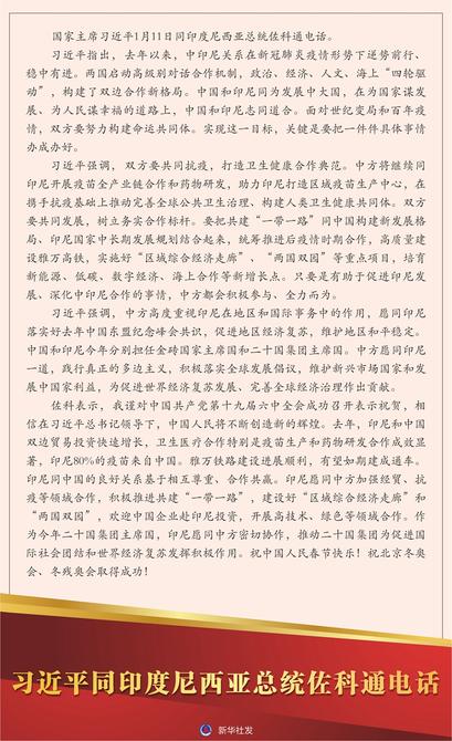 新华社北京1月11日电  国家主席习近平1月11日同印度尼西亚总统佐科通电话。
