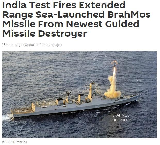 报道称,这次试射是印度海军最新导弹驱逐舰武器系统集成的一部分。“布拉莫斯”导弹的射程较远,它能在大约400公里的范围内精确地命中目标。