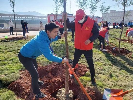 王伟(左)和中国青年在磨憨站前广场植树。中老两国青年栽种的60棵凤凰木组成的中老青年友谊林,寓意“火红的青春”,象征着两国深厚的友谊将在青年一代中延续。王伟供图