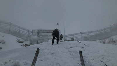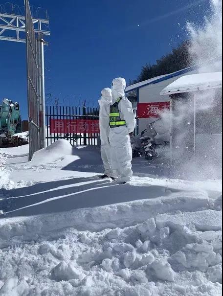 执勤人员迎着风雪站