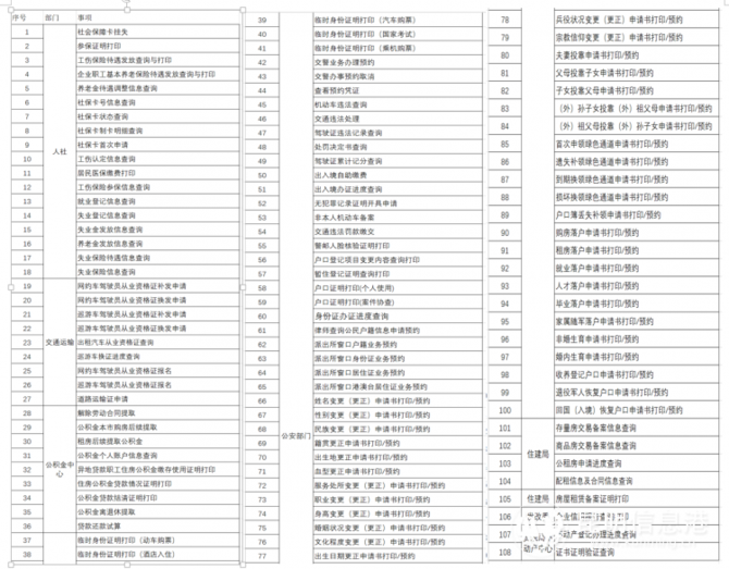 度假区行政审批局营商环境科科长吴芬远介绍,“e办通”政务服务自助机可提供治安、交警、出入境、公积金、人社、医保、规建、发改等108项高频事项办理。办理事项见下表: