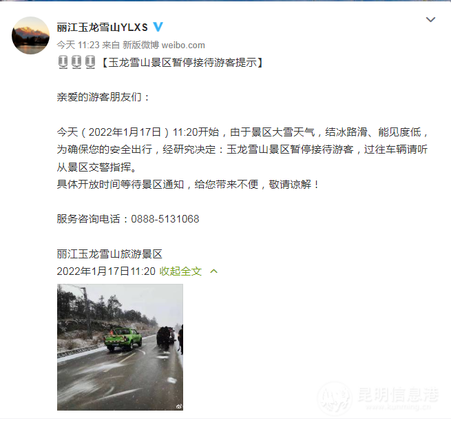 今天(2022年1月17日)11:20开始,由于景区大雪天气,结冰路滑、能见度低,为确保您的安全出行,经研究决定:玉龙雪山景区暂停接待游客,过往车辆请听从景区交警指挥。