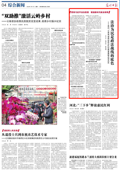 1月17日,光明日报4版刊发文章《法治为民是政法战线的底色——贵州、云南两省推动政法队伍教育整顿走深走实》,报道了第二批政法队伍教育整顿开展以来,贵州、云南两省政法机关突出政治建设、革除顽瘴痼疾、回应群众期盼,推动教育整顿走深走实。报道全文如下: