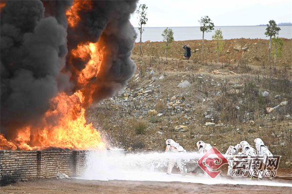 曲靖支队重型化工灭火救援编队以扑灭400平方米的大型油池起火为作战目标,针对大面积油池火灾具有燃烧速度快、燃烧猛烈、热辐射强烈等特点,分别在油池点火作战车辆预先展开、油池火呈猛烈燃烧状态等5个不同阶段,钳住泡沫验证是扑救易燃液体火灾最为基础和关键的环节,以“饱和攻击”为作战理念,组成灭火战术队形,利用泡沫管枪组、泡沫钩管组、中倍数和高倍数泡沫发生器实施“低、中、高”三类层次的泡沫叠加,形成“低倍数泡沫主灭火、中倍数泡沫推低倍、高倍数泡沫强补位”的三梯次进攻态势,发挥泡沫灭火药剂的最大作战效能,在强大泡沫射流的压制下,油池大火被成功扑灭,实现了此次化工灾害灭火救援实战演的预定目标。
