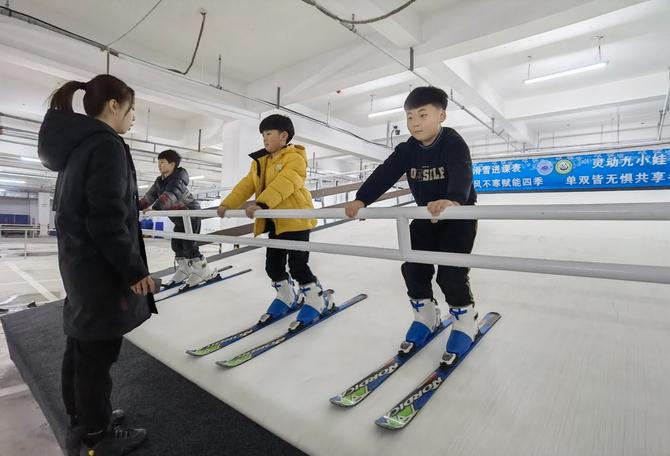 沈阳市浑南区第九小学的小学生在托管班老师指导下学习滑雪。新华社记者 王莹 摄