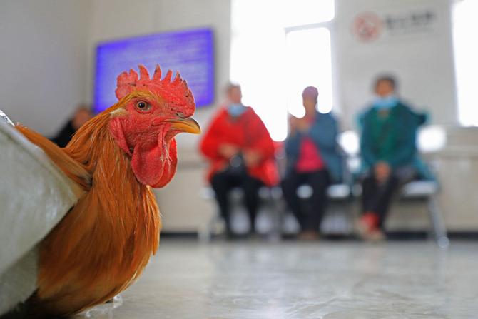 1月15日,在辽宁省凤城市石城站,农民带着准备售卖的公鸡在候车室休息。