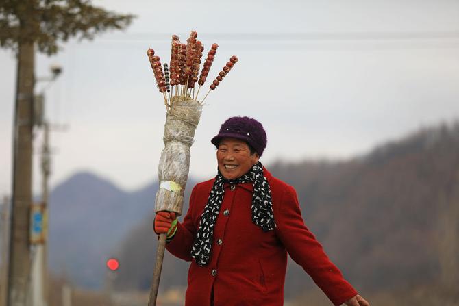 1月15日,在辽宁省凤城市石城站,一位农民带着自制的糖葫芦准备上车。