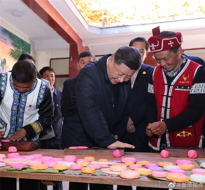 习近平总书记在腾冲市清水乡三家村中寨司莫拉佤族村,同村民李发顺一家制作当地节日传统食品大米粑粑。