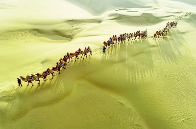 一支驼队在库布其沙漠行进。新华社发