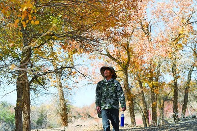 护林员魏存广在额济纳旗七道桥胡杨林区巡护。新华社发