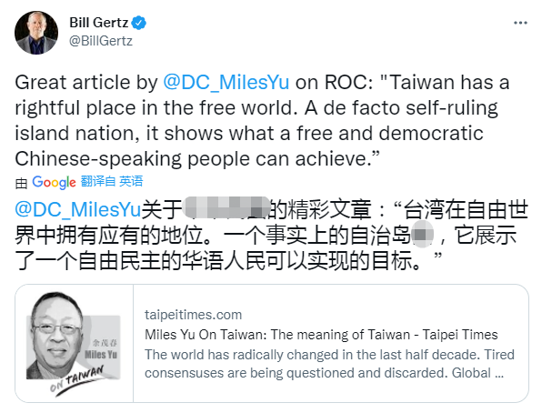 这篇文章发出后,《华盛顿时报》的资深反华记者,曾称中国是比苏联还危险的“邪恶帝国”的比尔·格茨就为它叫好。