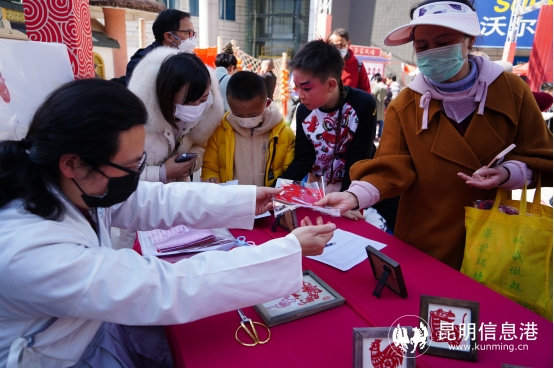 现场除了精彩的表演之外,还有窗花剪纸、编中国结、捏面人、吹糖人、春联纳福、年糕、草编等22个传统文化项目供现场观众参与,广大市民现场领取大观五福卡,参与传统文娱活动并收集大观印章,凭章兑换新春礼品,现场一片热火朝天的节日氛围。