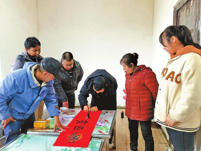 展厅里,一位老人正聚精会神地欣赏剑川本土画家何佩珍的国画《书斋情满》。老人叫徐湘云,是剑川一中的退休教师,“每年春节的书画展我们都爱看。这些画里有很多本土传统文化元素,所以每年我都会带上常年在外地工作的晚辈们来观展。”徐湘云告诉记者,“剑川过年还有一个特色,就是每家每户都会自己写春联,家里的小孩从小就学写毛笔字。”