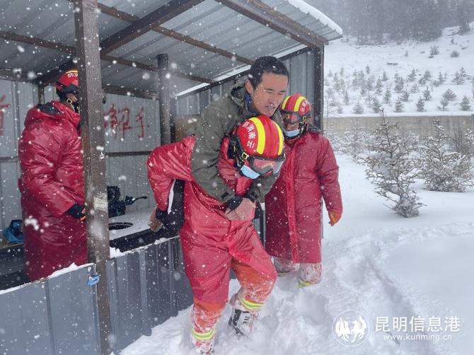 随即,消防救援人员继续奔赴现场,于11时30分抵达。“终于来了,终于来了,我太冷了”。见到消防员,这人很激动。经了解,该被困人员为浙江人,4号晚上从香格里拉徒步往德钦至白马雪山1号隧道附近时,由于突降暴雪无法前行,该男子就近在隧道旁寻找了一处简易庇护所驻停一晚。5号清晨醒来发现大雪仍未停止,周围积雪越来越厚,由于长时间处于低温环境,精疲力尽,且靴子已被冻住无法穿着继续前行,无奈之下只得选择报警。救援人员一边背负被困人员转移至消防车里,一边舒缓他紧张的情绪。在被困人员被成功解救,救援人员准备返回时,又接到报警称:在3号隧道附近1公里处有1车5人被困雪地......消防救援人员顾不上多想,迅速收整器材赶往现场实施营救。