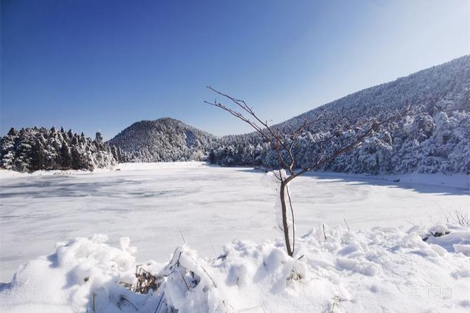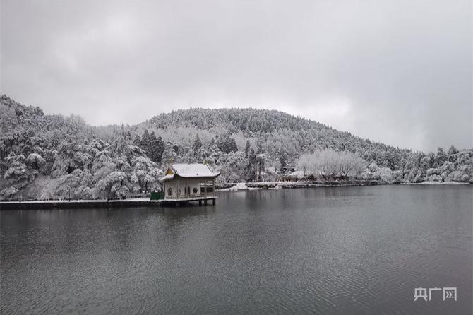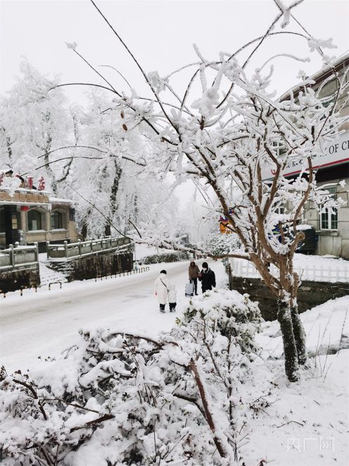 在庐山如琴湖景区,游客竞相拍照留影,把这玉洁冰清的雪景定格在相机和手机中。冬季庐山,白雪皑皑,雾凇冰挂蔚为壮观,加上庐山有许多红色屋顶的居民房,红白相间,仿佛童话世界一般。匡山冬韵美,处处是风景。