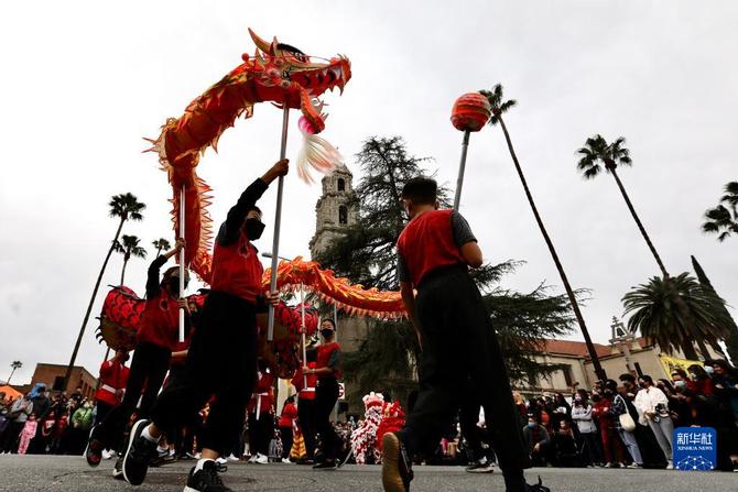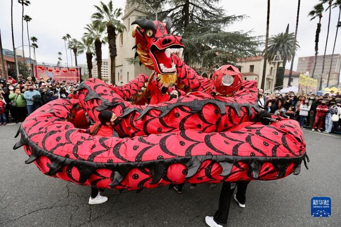 1月29日,人们在美国加利福尼亚州南部里弗赛德市举行的农历虎年新春庆祝活动上观看舞龙表演。因新冠疫情中断一年后,盛大的新春庆祝活动29日再度回归这座南加州内陆地区人口最多的城市。