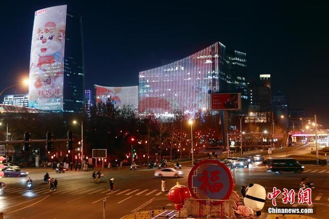 1月29日,北京中关村新年灯光秀“点亮”中关村大街。灯光秀通过《福虎献瑞》、《阖家团圆》、《燃动冰雪》三个主题篇章,运用喜庆、欢乐、科技的表现手法,彰显中华年俗文化丰富的内涵与文化底蕴,同时展现北京冬奥会的人文精神。 中新社记者 盛佳鹏 摄