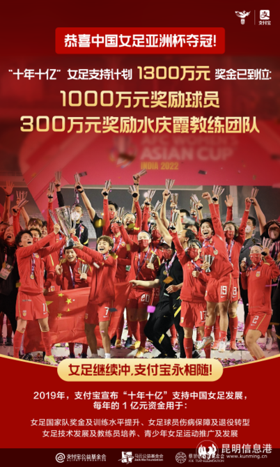 据悉,这1300万元的赛事夺冠奖金,全部出自支付宝“十年十亿”支持中国女足发展计划。该计划2019年启动,每年一个亿资金主要用于中国女足国家队的奖金及训练水平提升、女足球员伤病保障及退役转型、女足技术发展及教练员培养、青少年女足运动推广及发展等四个方面。