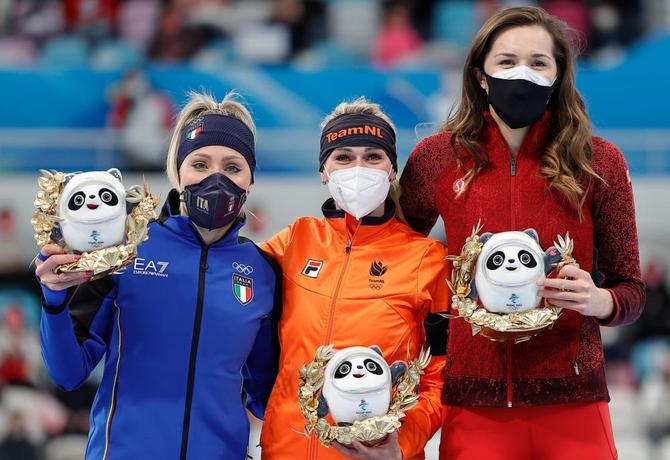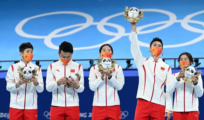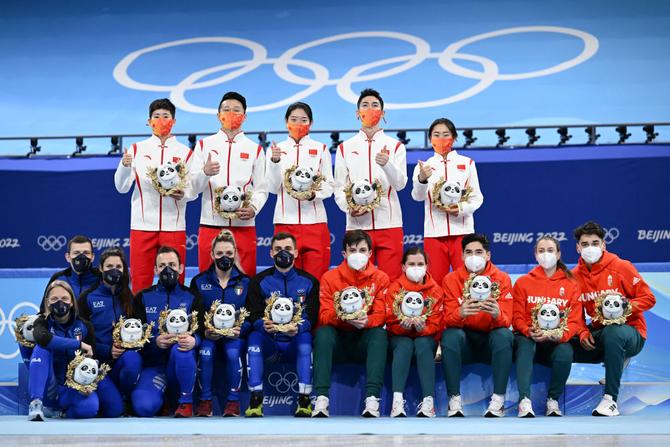 ⬆️2月5日,中国队选手在北京冬奥会短道速滑项目混合团体接力颁纪念品仪式上。