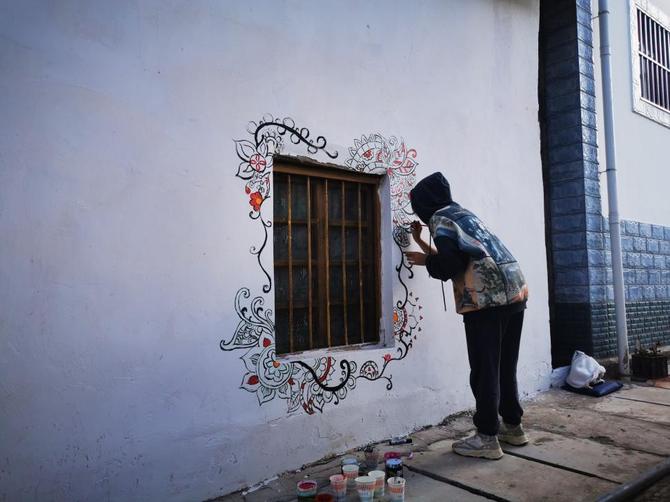 本村学生利用特长进行墙体美化