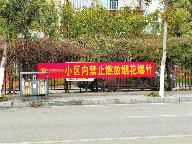 小区悬挂禁止燃放布标,安全第一。