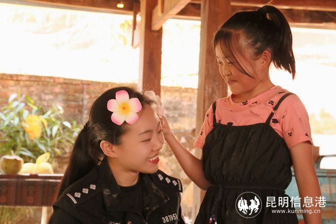 “叔叔阿姨保家卫国,过节也陪不了自己的家人,在这里我们就是你们的亲人,我要送阿姨鸡蛋花发卡!”傣族小朋友玉罕滴,用沾满糯米粉的小手为岳警官戴上头饰,鸡蛋花是西双版纳傣族群众招待宾客最好的特色花朵,花语是“孕育希望和充满爱”。