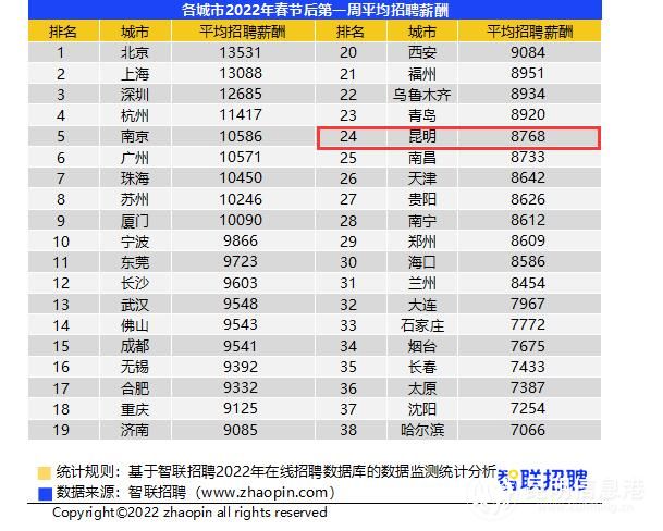 智联招聘近日发布《2022年春招市场行情周报》第一期,其中指出,春节后首周求职行为活跃,竞争指数同比翻倍,互联网和软件行业贡献2成招聘职位,线下消费复苏,带动健身、餐饮、零售、美容等人才需求明显上涨。昆明以8768元的平均招聘薪酬,位列全国38个主要城市的第24位。