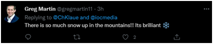 国际奥委会企业传播和公共事务总监克里斯蒂安·克劳似乎也很激动看到雪景:“冬天?冬天!今天早上北京又下雪了。”↓