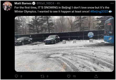 赞叹雪景的还有美国全国广播公司(NBC)主持人马特·巴恩斯,不过他自称似乎不太喜欢下雪天,但他仍发文表示:“(我来的)第一次,北京下起了雪!我不太喜欢下雪,但这是冬奥会啊。我想至少看到一次!”↓
