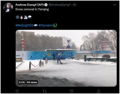 还有一些外媒记者关注到这场雪下得不小,很多工作人员在辛勤清扫。美联社体育频道记者安德鲁·丹普夫就发了一段视频,配文称:“在延庆的降雪清理(工作)。”↓
