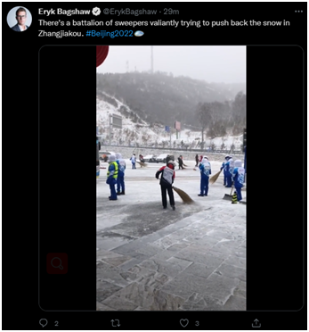 澳大利亚《悉尼先驱晨报》《时代报》记者埃里克·巴格肖同样也发布了一段清雪视频,赞扬工作人员:“在张家口,一大批扫雪人员在勇猛地清理着大雪。”↓