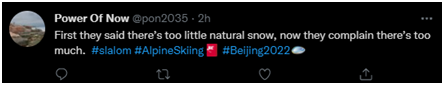 对于有人挑刺的举动,一位网友在“#北京2022”话题上发文讽刺,意味深长:“一开始他们说天然雪太少了,现在他们又抱怨太多了。”↓