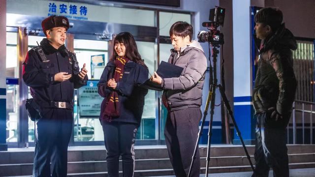 1月29日凌晨,光明日报记者彭景晖(右二)等在北京市公安局朝阳分局高碑店派出所采访。