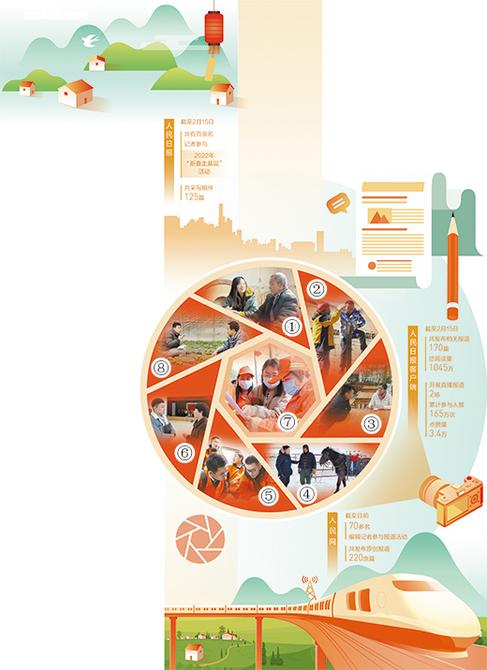 图①至图⑧依次为本报重庆分社记者常碧罗(左)、青海分社记者贾丰丰(右)、湖南分社记者王云娜(右)、内蒙古分社记者吴勇(左)、福建分社记者刘晓宇(左)、浙江分社记者窦瀚洋(左)、广西分社记者祝佳祺(中)及人民网记者冯亚涛(左)在春节期间深入基层采访。