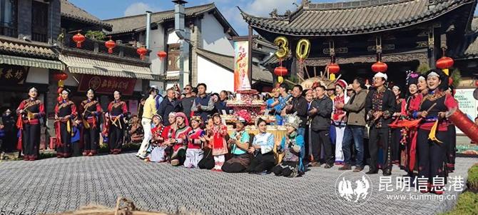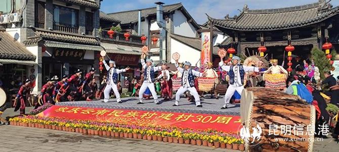 2月18日上午10时,云南民族村建村30周年庆祝活动在25个少数民族欢快的舞蹈中开启。紧接着,纳西族勒巴鼓、藏族热巴鼓、哈尼族地鼓、基诺族太阳鼓、佤族木鼓等组合成一个民族鼓阵,热烈的鼓声响彻民族村。25个少数民族也以激情的舞蹈纷纷为民族村送上生日祝福。随后,30名村寨员工、景区导游每人手捧一个小蛋糕组成蛋糕塔,30支礼花齐放,26个民族共同祝福云南民族村生日快乐。