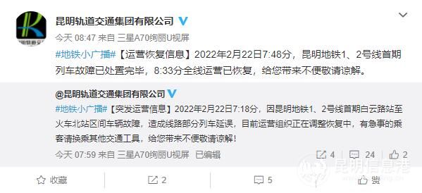 6686体育讯 记者从昆明轨道交通集团有限公司获悉,22日上午7时18分,昆明地铁1、2号线首期白云路站至火车北站区间车辆故障,造成线路部分列车延误。7:48分,故障已处置完毕,8:33分全线运营已恢复。
