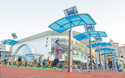 近年来,各地紧贴市民就近健身需求,不断完善城市体育健身基础设施。图为江苏省宿迁市宿城区文体中心,体育健身广场投入使用,吸引附近市民前来锻炼。
