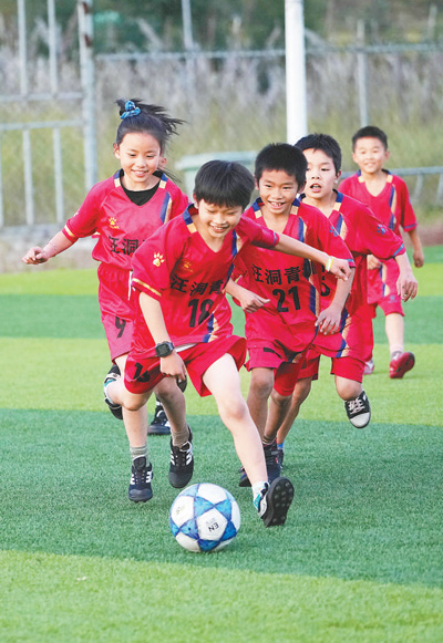 全民健身如火如荼,群众运动热情高涨。图为广西壮族自治区柳州市融水苗族自治县汪洞乡,少儿足球队队员在比赛。