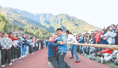 贵州省黔东南苗族侗族自治州从江县各中小学校积极开设体育运动类课程,帮助山里娃在体育锻炼中享受乐趣、增强体质。图为从江县刚边壮族乡中心小学的学生在校园运动会上拔河。